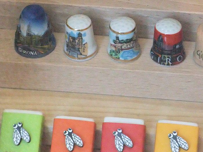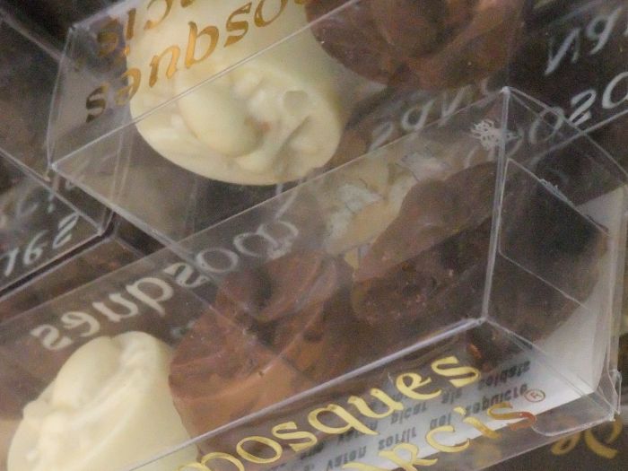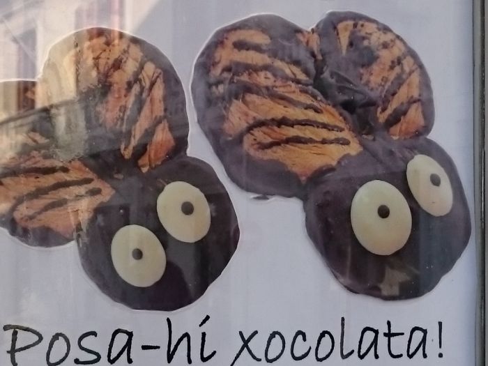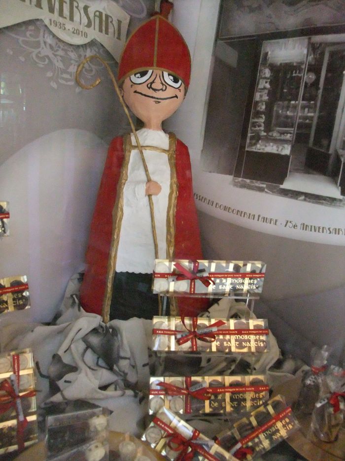 こちらは橋を渡った旧市街の中心にあったお菓子屋さんのショーウィンドーです(数年前にたぶん閉店)。ジローナ守護聖人の聖ナルシスと、ハエのチョコレートが見られます。