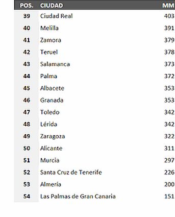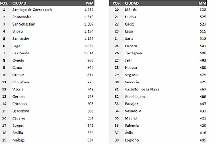 ビルバオ、サンタンデール、ルゴ、ラ・コルーニャ、オビエドと北部都市がずらりとランキングのトップを飾ります。