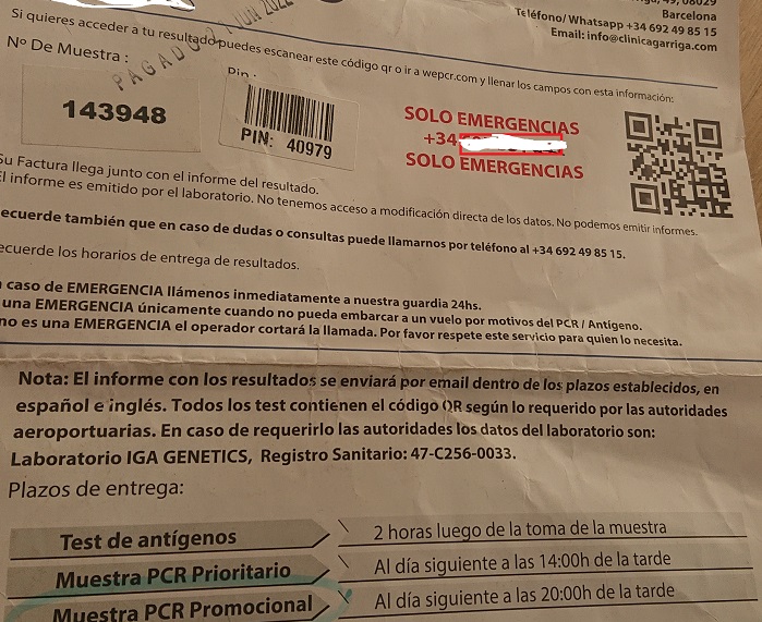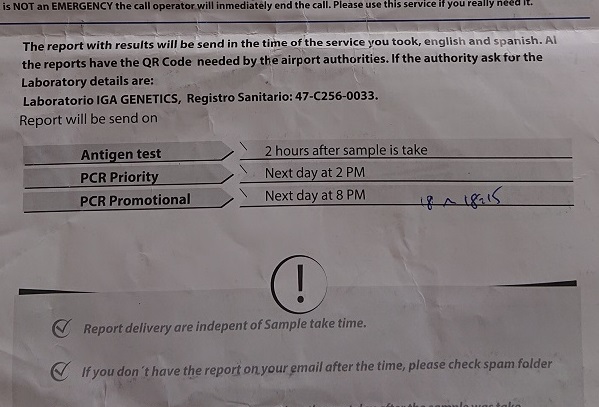 検査が終わると、もらう紙。裏は英語表記でした。「緊急の電話番号」がありました。この検査機関のwebに記載されない番号なのでここでは白消ししてます。緊急の場合だけと主張してありますので守ってくださいね。